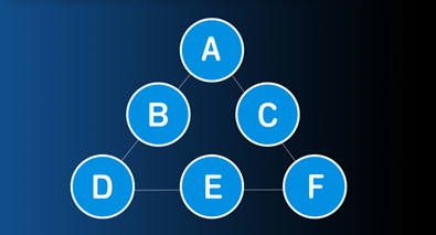 Escribe los números de 1 al 6 con su letra correspondiente (A,B,C,D,E,F) para que de cada lado sume 9. Sólo puedes usar cada número una vez. Ten en cuenta que A=1.
